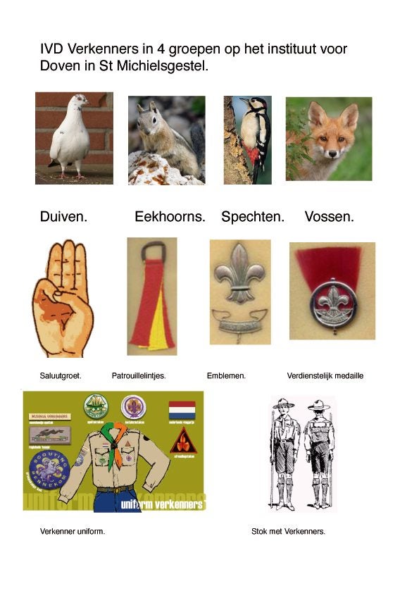 Foto's van de verkennersgroepen de bovenste van hutten de elke plaatjes het genoemde duiven - eekhoorn - spechten - vossen.