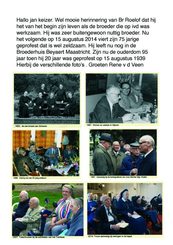 Helaas ken ik Br Roelof wel goed maar in het tijd heb ik niet met hem in contact gehad, toch ben ik bij de Broederhuis " de Beyart " geweest en zag ik Br Roelof wel en hebben elkaar gesproken, men ziet ik hem zo wel erg oud en kunt bijna helemaal niet meer lopen en wat ook het woorden zo makkelijk vergeetachtig. Van hem 75 jarige broeder was ik niet aanwezig doordat op 15 augustus d.d. vieren 9 Broeders hun jubilarissen . een broeder 75 jaar ( Br Roelof ) en twee 70 jaar en drie 60 jaar en drie 50 jaar.