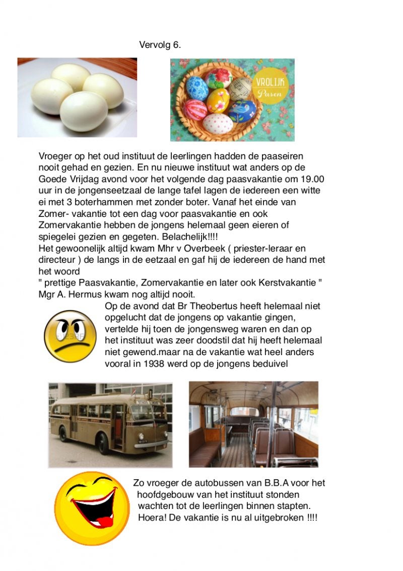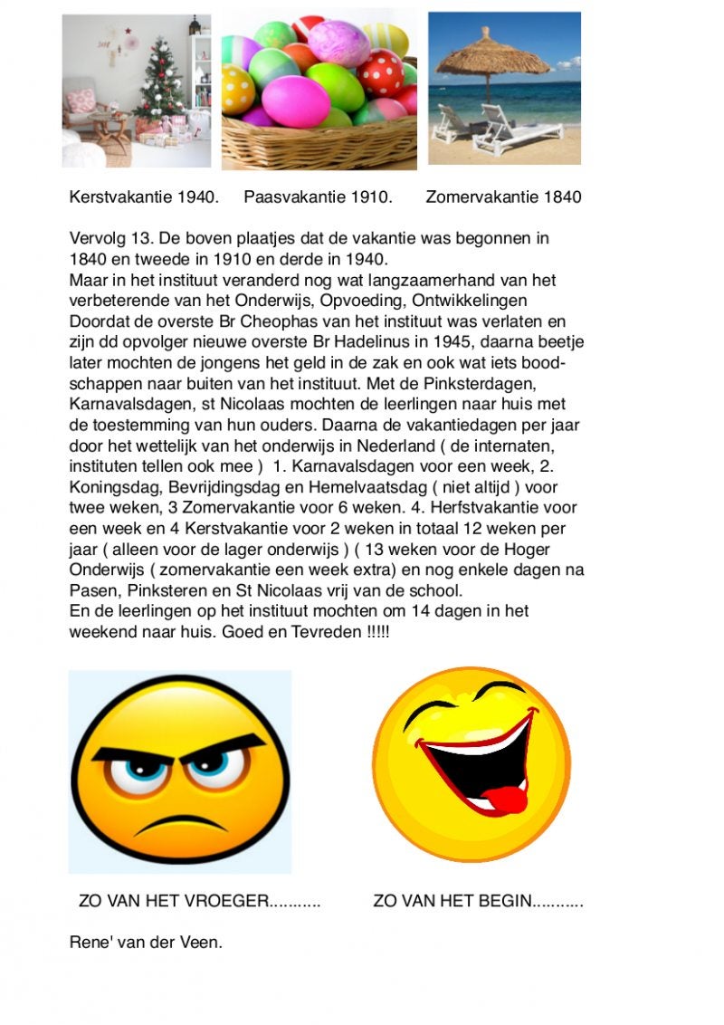 Interessant verhaal over vroeger, zoals vakantie... Ja dat klopt, vroeger heel weinig vakantiedagen... Toen ik in 1952 daar kwam, had ik toen maar drie vakanties, zomervakantie, kerstvakantie en Paasvakantie, zoals jullie vroeger... Later gelukkig uitgebreid....