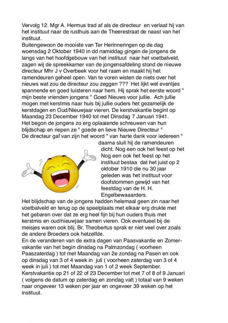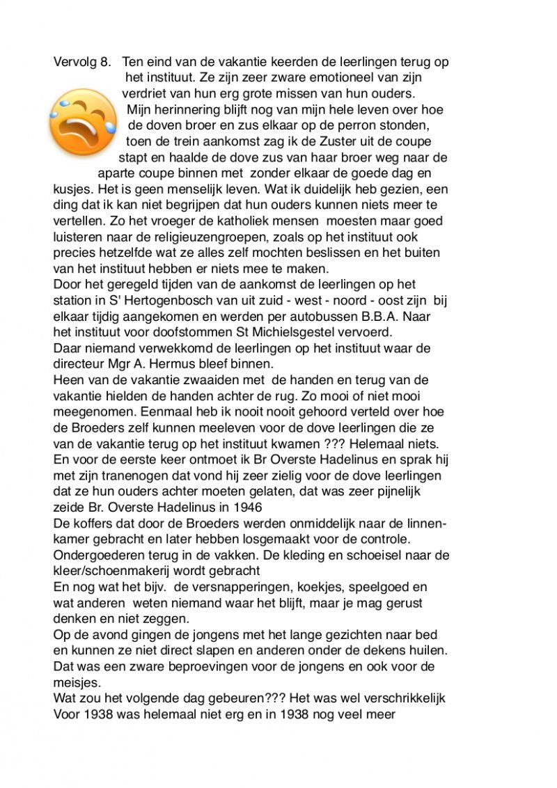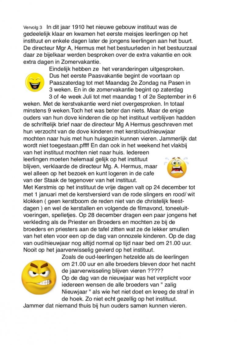 Carien en Peter. Oja dat jullie hebben het gelezen en vraagje mij over mij het leven op het instituut van mijn de herinnering. Ik ben in 1932 op het instituut opgenomen en mijn ouders de woonachtig in Breda. De periodejaar 1932 - 1939 ben ik in totaal 43 weken op het instituut gebleven en 9 weken op vakantie bij mijn ouders. In het weekend mocht ik helemaal niet naar huis bij mijn ouders, maar mijn ouders hebben wel vaak gevraagd per schriftelijk brief naar de directeur Mgr A. Hermus dat gaat over zijn zoon Rene met de kerstmis/ jaarverwisseling naar huis mocht gaat., Helaas heeft de directeur Mgr A Hermus geweigerd en dat heeft hij het antwoordt geschreven voor mijn ouders die er op staat de rijk en arm moeten het gelijk op het instituut blijven, maar van mij dat klopt niet want op het instituut de rijker dove leerlingen kregen het apart met de speciaal het betaalde kostwinners. Ze kregen een speciaal tafel met tafelkleed en goed heerlijk diner en maaltijd en ook apart open slaapzaal en ook in vrije tijd mochten in de tuin van de Broeders wandelen, op terras op stoel zitten met de frisse drank. Mijn vader de deurwaarder der belastingen dat het instituut wisten ook en hebben hem gevraagd of Rene op het instituut met de rijker jongens toebehoort.