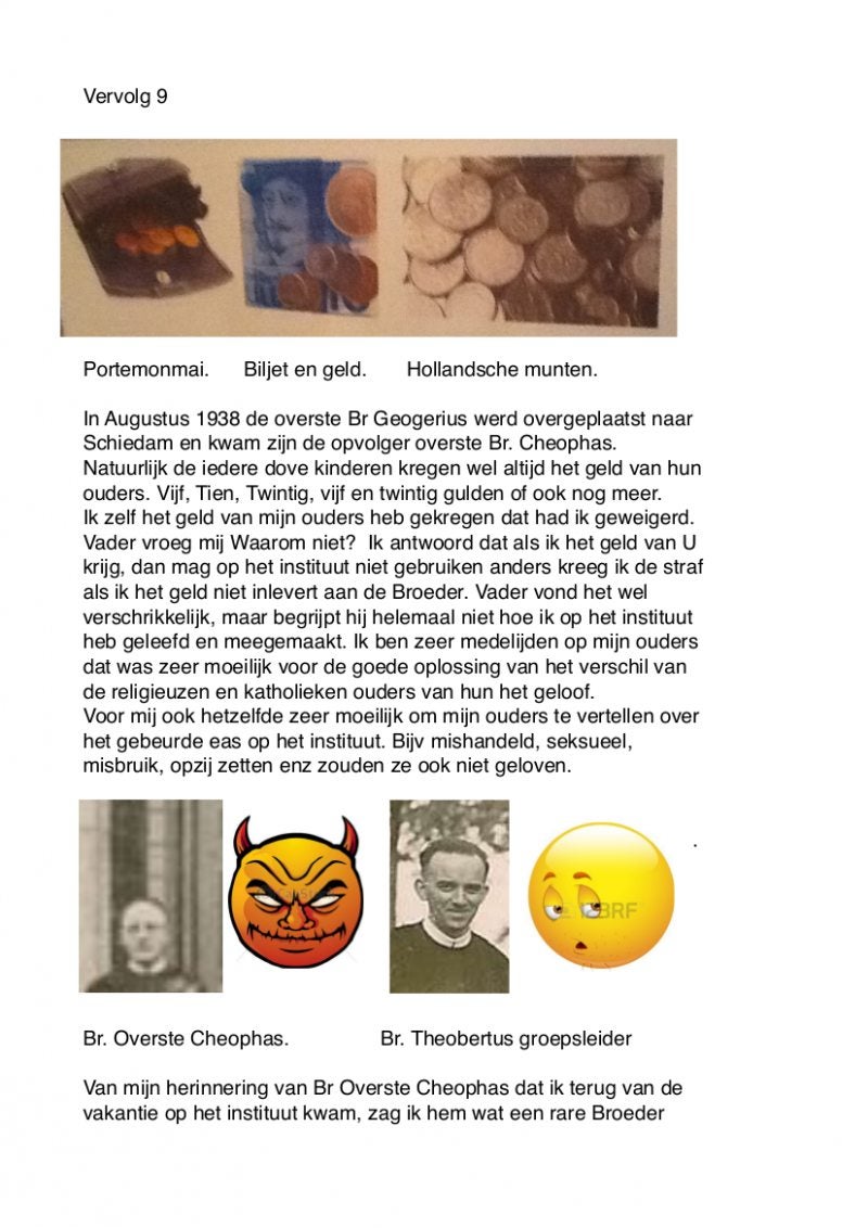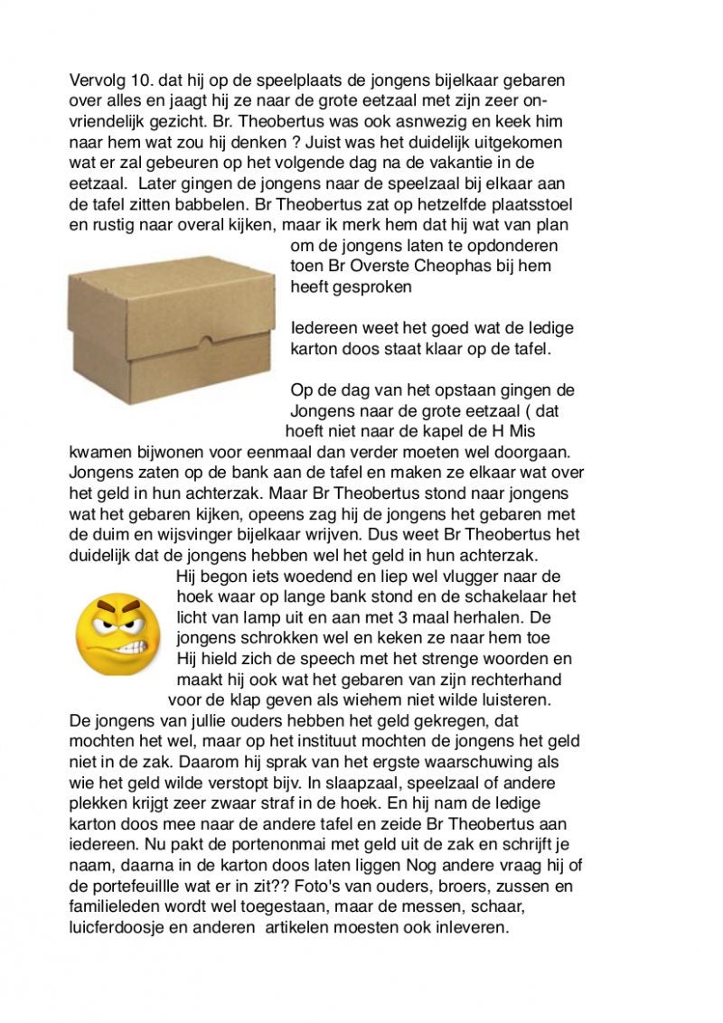 Over zakgeld klopt als het bus. Ik moest vroeger zakgeld aan groepsleider geven, ongeveer 10 gulden in het begin en later ongeveer 20 gulden. Bij Br. Theobertus later toen ik bij hem zat, was niet meer verplicht om af te staan maar iedereen deed toch voor alle veiligheid, want daar was nog heel wat gestolen. Br. Theobertus noteerde in de kasboek als ik geld aan hem gaf, zodat ik zelf kon controleren of dat klopte. Hij was niet meer zo streng zoals vroeger. Gelukkig maar...