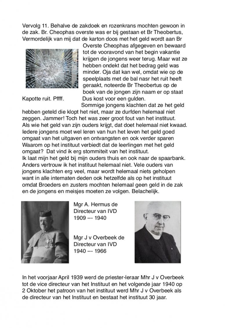 Mijn vader had geweigerd en heeft gezegd dat de rijker en armer dove leerlingen blijven gelijk opvoeding, onderwijzen, enz. Zo het vroeger op het instituut was gebeurd, gelukkig dankzij aan de vice directeur J v Overbeek dat hij heeft het apart van de rijke dove leerlingen geheel van de tafel weggevaagd en voortaan helemaal gelijk het leven op het instituut. Tuurlijk ik gaf hem groot gelijk. Mijn klasgenoot Arie de Goede zijn zus ( Marie de Goede ) ook op het instituut bij de meisjesafdeling dat hij heeft meermalen de toestemming gevraagd of hij in het weekend bij zijn zus mag komen bezoeken? Dat wordt ook niet toegestaan van de directeur en Br Overste.