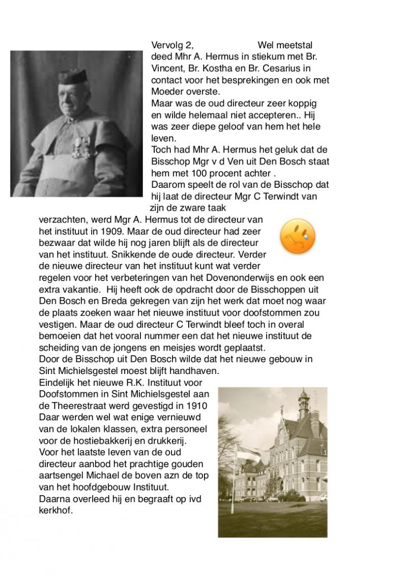 Carien, Frans en Jan jullie hebben op site geschreven over in het tweede wereldoorlog in rond 1942 kwamen wel paar duisters op het instituut en ze namen de dame oud- leerling mee. Helaas de directeur v Overbeek had wel fel geprosteseerd, maar werd niets geholpen. De dame oud- leerling was toch katholiek dat was de afkomstig van de joden. Maar een ding kan ik niet begrijpen dat Mgr Hermus de directeur van het instituut en ook de ZIELZORGER voor alle dove leerlingen, dus wist hij het goed in 1933 toen in Duitsland de overal mensen hadden geschreeuwd op Adolf Hitler alles in zijn macht van hele land Duitsland kunt beheersen. Dasrna hield Adolf de speech dat gaat over het vervolging der Joden dat wilde hij graag zien dat de joden in Duitsland alles mogelijk moeten aanpakken. Dat het gebeurt op 9 november 1938 verwoesten de nazi's in heel Duitsland joden winkels en synogoges in de stad Bieletefd.